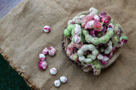 Group of Manila tamarind fruit or Pithecellobium dulce is another type of Thai herb on wooden log background. Top view, Selective focus.