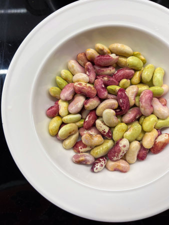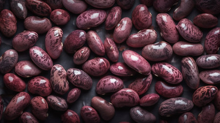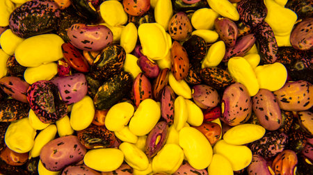A captivating display of colorful beans arranged artfully on a dark surface. Perfect for themes of culinary arts, organic food, or nutrition.