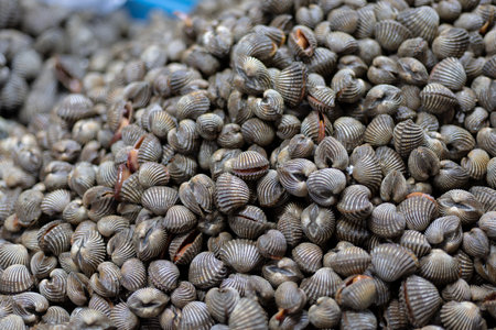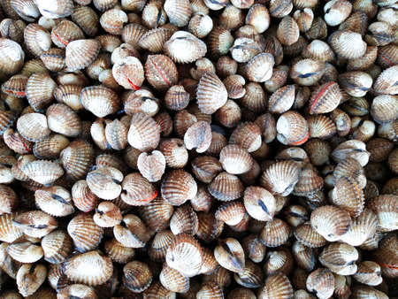 Fresh cockle in the market.cockles seafood, pile of​ fresh blood cockles top view, cockles or scallop fresh raw shellfish