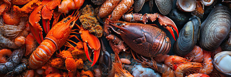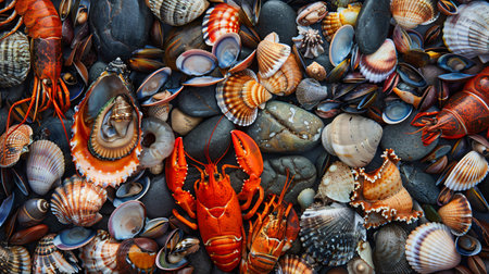 The scene showcases a rich assortment of fresh seafood, including lobsters, shrimp, and various shellfish, laid out against a colorful, organic backdrop. This vibrant collection highlights the diversity and beauty of marine life, inviting appreciation for nature's bounty.