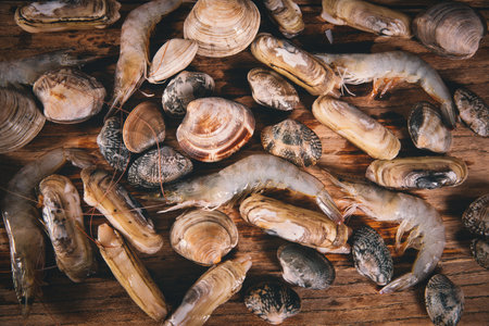 Fresh seafood on a wooden background. Shrimp, mussel, shrimp, shellfish