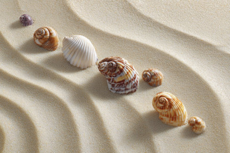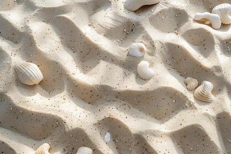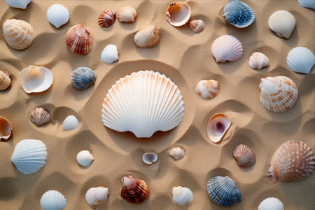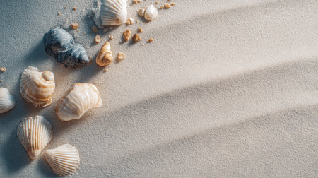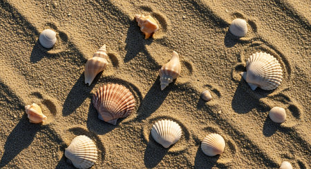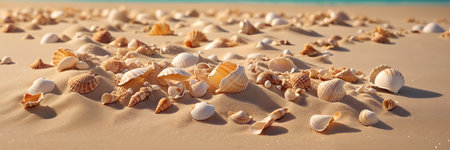 A Seashells scattered on soft sand create serene beach atmosphere