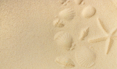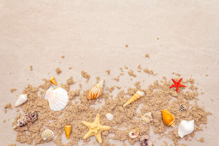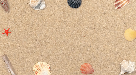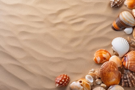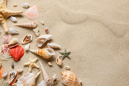 Seashells on sandy beach. Top view with copy space. Summer travel background design