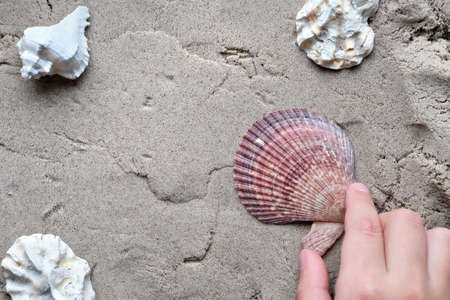 Child's hand picking up shells from wet sand on a sandy beach, sand and sea background with copy-space