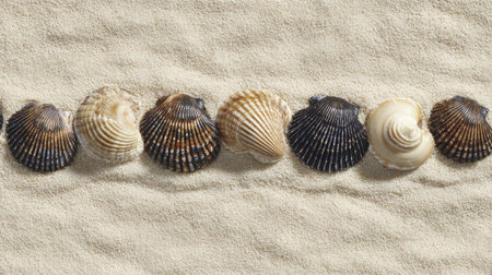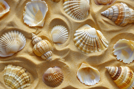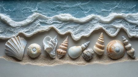 A captivating display of various seashells arranged beautifully on soft sandy beach, capturing the essence of summer and the ocean's natural artistry.