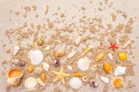 Summer advertising marine concept on a beige background. Background with seashells different shape and type in the sand. Top view, copy space