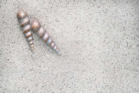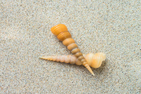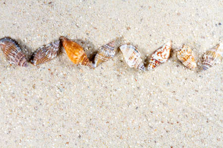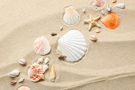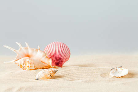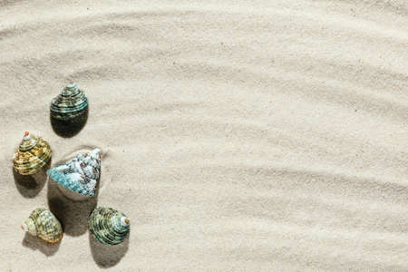 Sea shells with sand as background. Summer beach.
