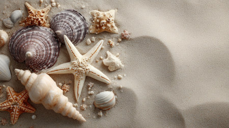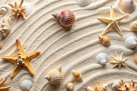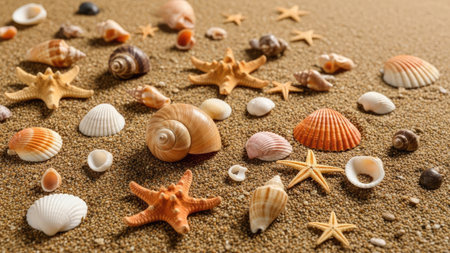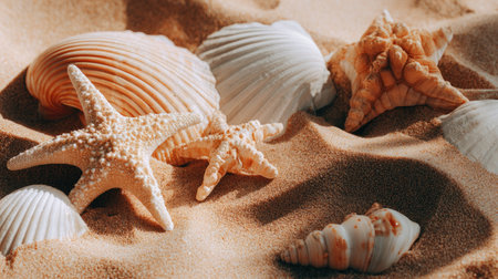 A captivating arrangement of various shells and starfish on sunlit soft sand, creating a serene beach atmosphere perfect for summer relaxation and vacation vibes.