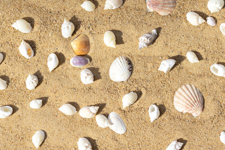 Sea background with shells on a sandy beach on summer day. Seashells on sand texture or pattern. View from above.