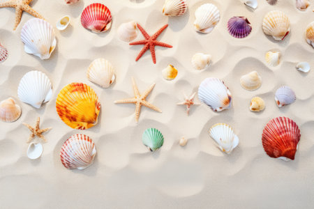 AI Generated. Colorful Shells and Starfish on Sandy Beach Surface