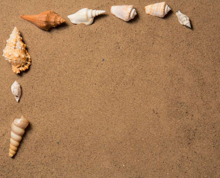Border with shells on the sand. Seashells on a sandy beach background with a copy space. View from above.
