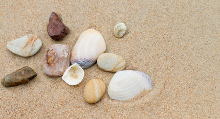 Rocks and seashells arranged on sand, soft natural light, clear copyspace, calm beach mood.