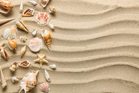 Seashells on sand background. Summer vacation concept. Top view.