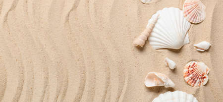 Different sea shells on beach sand. banner design