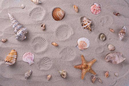 Seashells on the sand. Summer background. Top view.