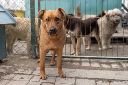 Shelter life of brown dog. Abandoned dog in rescue shelter, brown fur, loyal heart. Adopt, rescue, love. Dog behind bars in animal shelter, hoping for adoption. Homeless brown dog in kennel