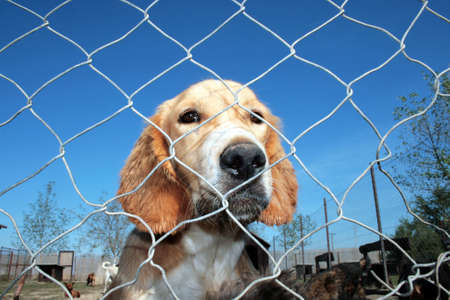 Portrait of sad dog in shelter behind fence waiting to be rescued and adopted to new home. Shelter for animals concept