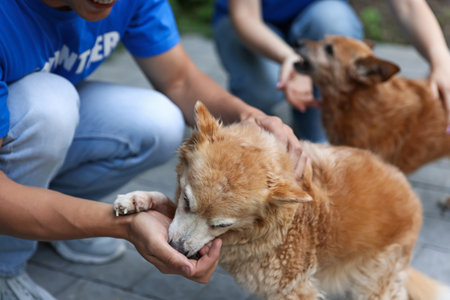 Pet adoption. Friendship between people and dog. Woman choosing dog from animal shelter