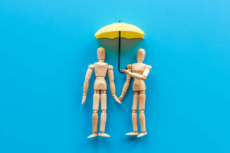 A hand holds an umbrella over wooden peg figures, illustrating the concept of business and family protection, emphasizing security and essential risk management.