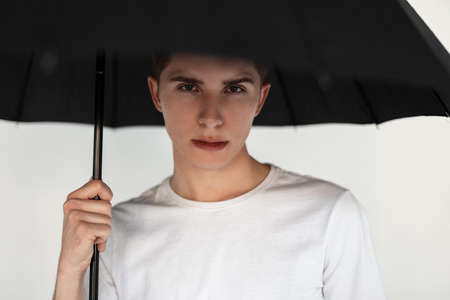 Good-looking young man in stylish casual t-shirt with fashion black umbrella isolated on white background in studio. pretty handsome guy takes cover by an umbrella in the room. Youth summer menswear.