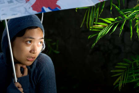 portrait of asian woman on her sweater and holding an umbrella on a cold and rainy night. seems to worry of something and feeling insecure of her current circumstances.