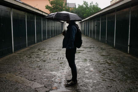 Man in casual wear and backpack standing in garage alley with umbrella in rainy autumn weather. Photo in dark colors. Lifestyle and autumn concept.