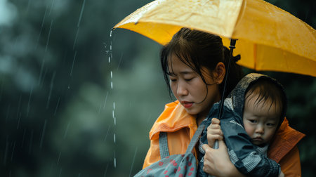 Generative AI : concept the social protection of the family family took refuge from the miseries and rain under an umbrella