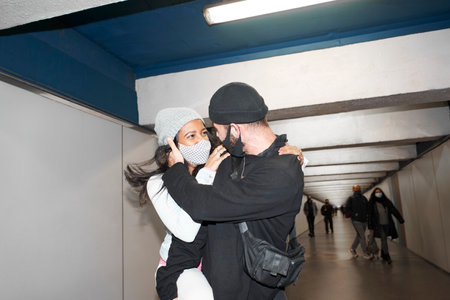 Young interracial couple of lovers in face masks and wool hats love each other in the crowd in an underground subway corridor in each other's arms down an old public transportation corridor.