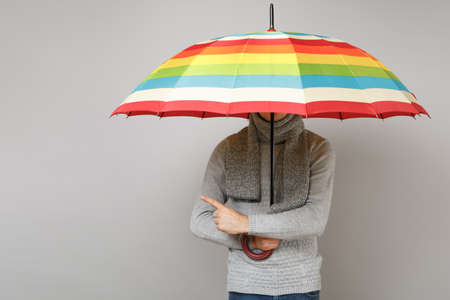 Young man in gray sweater, scarf covering face with colorful umbrella, pointing index finger aside isolated on grey background. Healthy fashion lifestyle people sincere emotions, cold season concept