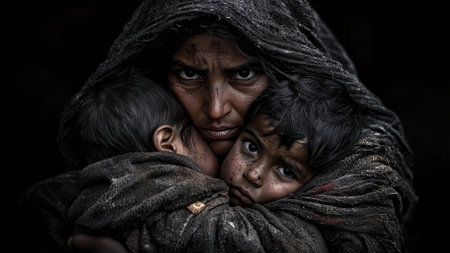 Side view of young mother holding sleeping son while hiding in refugee shelter and sitting on floor covered with blankets