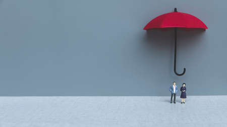 Concept of people with protection. A red umbrella with a miniature couple on grey background with copy space.