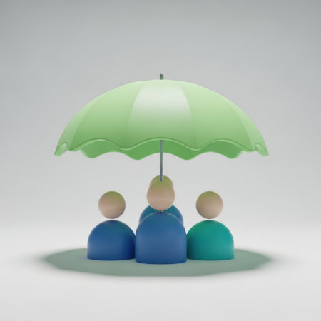 Stylized figures are sheltered by a vibrant green umbrella, symbolizing protection and care.
