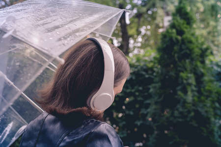 Autumn. Lonely sad woman in a headphones walking in a park, garden. View through wet transparent umbrella with rain drops. Rainy day landscape.