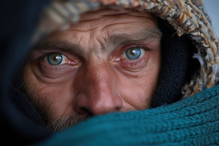 portrait, look of an elderly homeless man wrapped in warm clothes