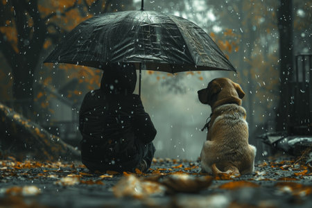 A boy and his dog under a large umbrella in the rain, the connection between child and pet