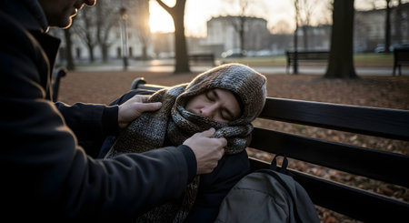 A person is gently adjusting a scarf around a homeless man who is sleeping on a park bench in the cold. This compassionate act demonstrates kindness, charity, and helping those in need. The scene is a powerful depiction of empathy and humanitarianism.