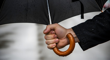 A close-up shot of a man's hand firmly gripping the curved wooden handle of a black umbrella. Raindrops are visible on the umbrella fabric and the man's jacket sleeve, suggesting wet, rainy weather.