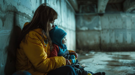 Portrait of young Caucasian woman embracing son while hiding in refugee shelter and sitting on floor covered with blankets, copy space