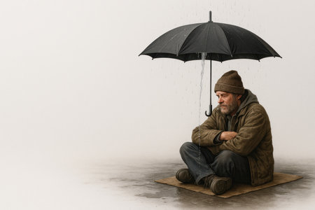 Lonely homeless man sitting under an umbrella in the rain. Space for text