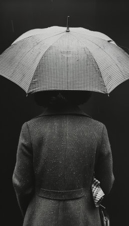 Female outdoors in rainy night, rear view of the elegant woman under black umbrella looking on the city lights, city life, loneliness and melancholy concept..