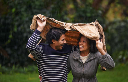 Here comes the rain. Cropped shot of an affectionate young couple trying to escape the rain.