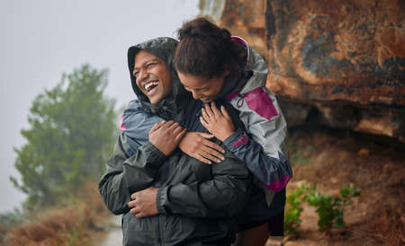 No one could ever make me feel the way you do. Shot of a young couple wearing their rain jackets while out hiking.
