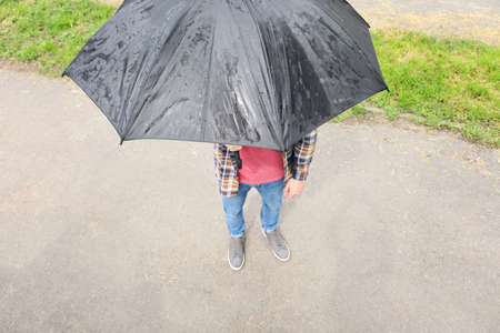Man with umbrella in rain. Gloomy weather in city. Selective focus on the raindrop.