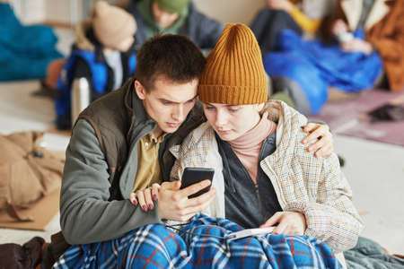 Front view portrait of young Caucasian couple hiding in refugee shelter covered with blanket on floor and holding smartphone