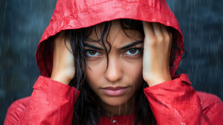 A woman in a red rain jacket holding her head with both hands, AI