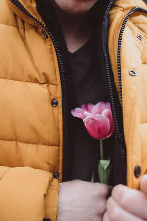 Handsome man have a flower, pink tulip to girlfriend