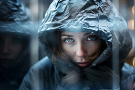 Young woman in raincoat in rainy weather. Portrait of female in wet waterproof coat. close up