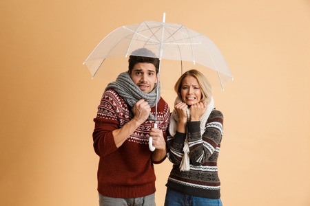 Portrait of a frozen young couple dressed in sweaters and scarves standing together isolated over beige background, standing under umbrella