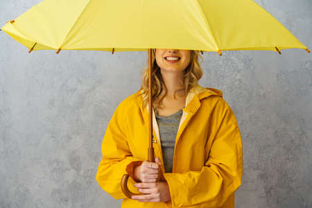 Lovely cheerful young woman wearing waterproof coat holding umbrella isolated over gray background