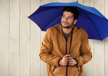 Digital composite of Man against wood with umbrella